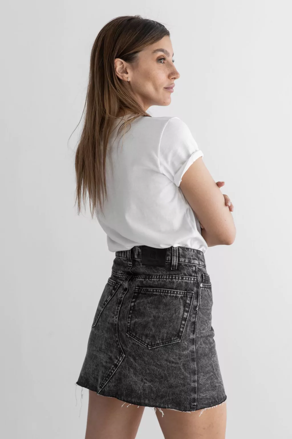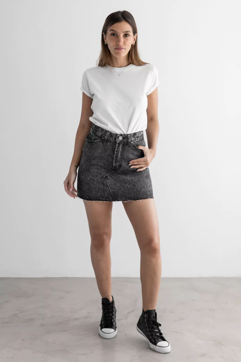 Falda de Jean. Tiro Alto, con terminación desflecada. Lavado: Wash