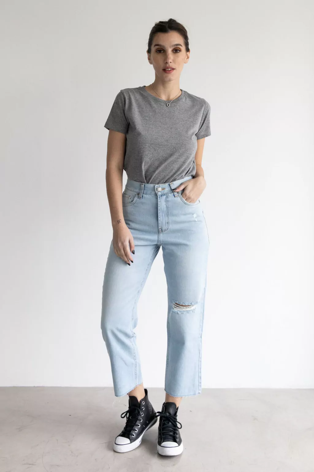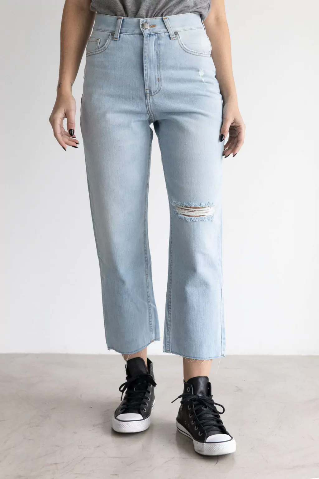 Tiro alto, corte recto, con lavado localizado y rotura en la rodilla izquierda.