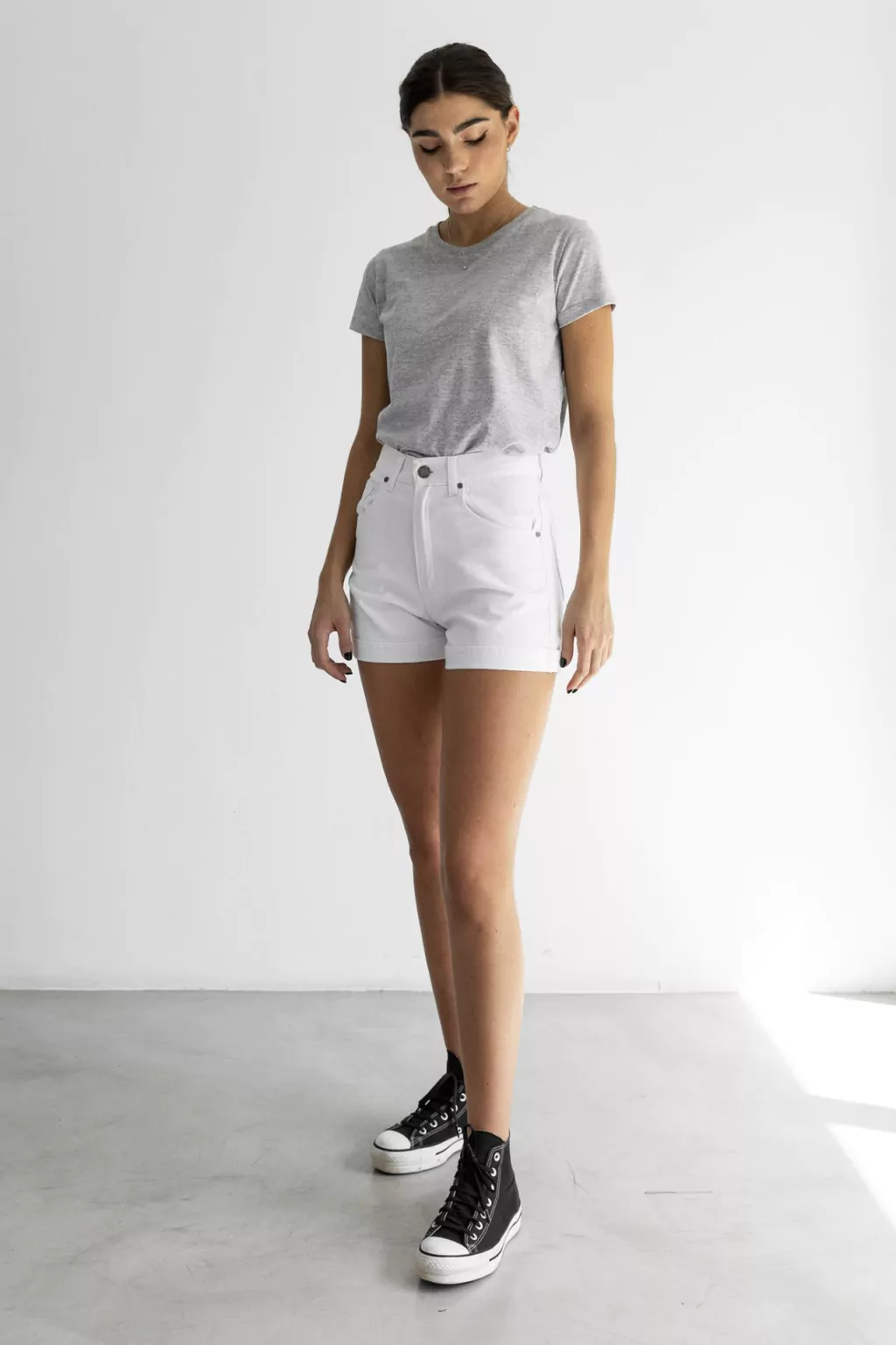 Short de Jean blanco. Tiro Alto, con botamanga.
