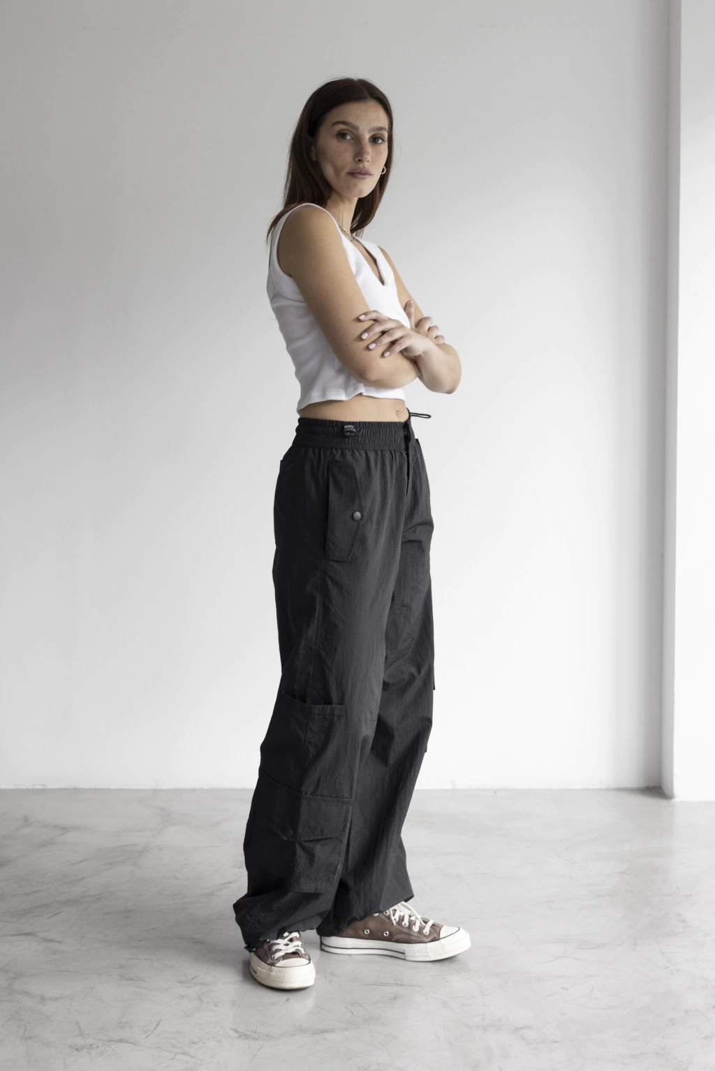 Tiene dos bolsillos en los laterales a la altura de la cadera, dos grandes con tapa y broche, y otro bolsillo chico con vivo ancho en las piernas. En la parte trasera tiene dos bolsillos cuadrados.