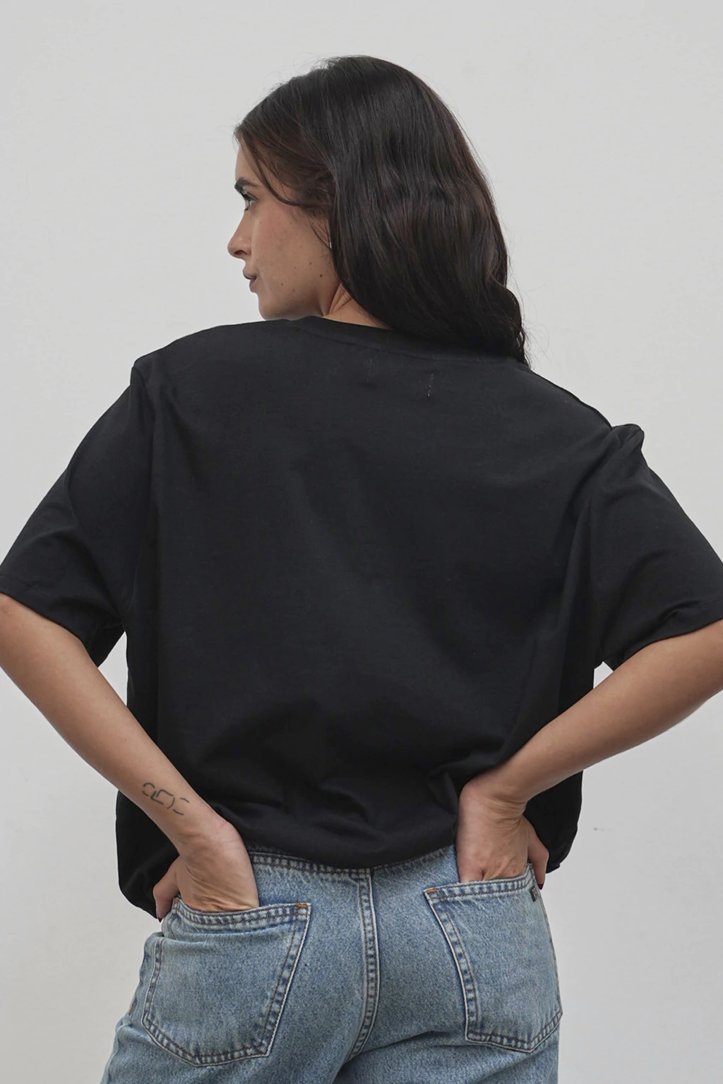 Remera realizado en jersey 100% algodón. Corte boxyfit, con estampa con relieve en la parte delantera a tono. Tiene un elástico con una tanca en el ruedo para poder usar abuchonada