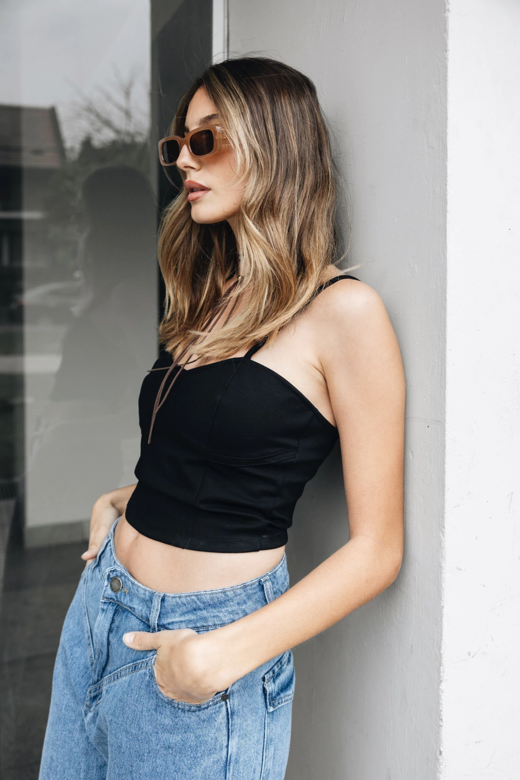 Top con bretel fino, con corte corset, tiene recortes que acompañan la forma del torso. En el recorte del bajo busto tiene un vivo a tono que funciona como detalle.